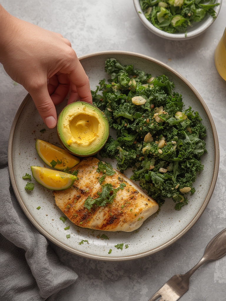 Dinner: Sautéed Kale with Garlic, served alongside baked salmon and roasted sweet potatoes, providing a balanced mix of protein, healthy fats, and complex carbs.